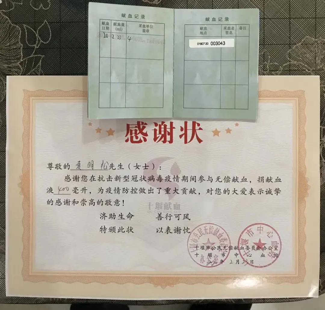 “血液庫存已經告急,臨床血液供應面臨著嚴峻考驗,疫情中的重型感染患者、孕產婦、血液病患者、惡性腫瘤、意外受傷者等急需用血的病人,他們的生命健康正在受到威脅……”當看到十堰市防控指揮部發出的緊急通知,正在社區做志愿工作的夏明松再也坐不住了,他向社區請了一小時的假,立刻趕往十堰市中心血站加入到無償獻血的隊伍中。