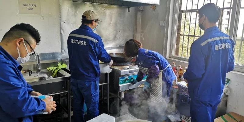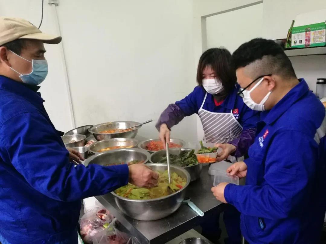 在完成施工任務(wù)后,郭慶波又與鄭幼芳、龔愛(ài)民、劉煥兵、龔昆及炊事員李淑華等同志一起,為在酒店隔離的80多位突擊隊(duì)員烹飪可口的飯菜。