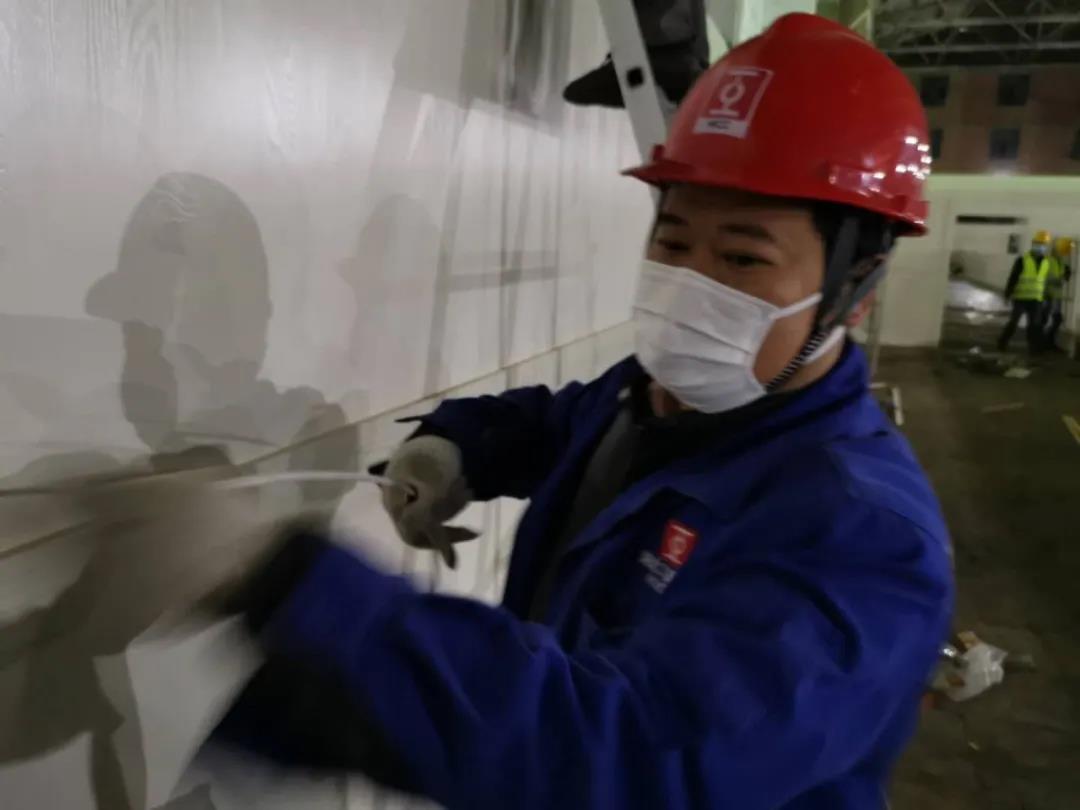 來武漢客廳的第一天就是“白加黑”。到在現(xiàn)場,他便迅速進入了角色,臨電安裝、接線、搬運鋪設(shè)床鋪、安裝隔離門板、臟活累活搶著干,絲毫不馬虎。一雙手套不到半天就磨破了。三天三夜里馬不停蹄,他既是現(xiàn)場電氣工長。還是后勤員,協(xié)調(diào)機具、記錄考勤、……只要是力所能及的工作,他都一絲不茍?!罢f不辛苦是假的,緊繃的神經(jīng)和壓力、多日來連軸轉(zhuǎn)的精力消耗對我們來說都是一種挑戰(zhàn),但是對比奮戰(zhàn)在一線的醫(yī)護人員,我們太微不足道了?!崩钣窳终f。