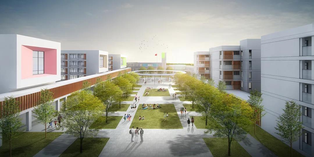 本項目致力于打造出一個具有高品質(zhì)教學(xué)環(huán)境和時代氣息的現(xiàn)代化校園。功能布局上以“智慧圓環(huán)”為中心,以入口林蔭大道和中心景觀大草坪為“雙禮賓軸線”,根據(jù)動靜分區(qū)原則將行政、教學(xué)、住宿、后勤和運(yùn)動等五大功能分區(qū)合理布局,學(xué)習(xí)和生活空間采用半圍合式院落布局,創(chuàng)造一個安靜的教學(xué)環(huán)境,在滿足教學(xué)及生活的基本功能情況下,同時為學(xué)生在課間休憩、課外學(xué)習(xí)、師生交流需求上設(shè)計出不同的空間場所。通過教學(xué)、社交、自然的相互碰撞融合形成一個輕松愉悅的學(xué)習(xí)環(huán)境。讓青少年學(xué)生們在這里擁有逆風(fēng)攀登向陽而生的力量。