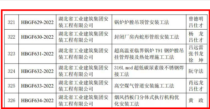 近日,湖北省住房和城鄉建設廳發布了《關于2022年度湖北省工程建設工法(土木工程類、工業安裝工程類)評審結果的公告》,安裝公司申報的《鍋爐爐膛吊頂管安裝工法》、《封閉廠房內蛇形管組安裝工法》等6項工法被評為2022年度省級工法。
