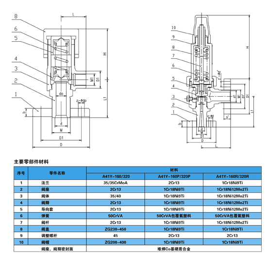 彈簧微啟式高壓安全閥(A41H-160/A41Y-320)適用于工作溫度≤200℃的空氣、氮?dú)浠旌蠚狻⑺冉橘|(zhì)的設(shè)備和管路上。A41Y-160P/A41Y-320P型彈簧微啟式安全閥適于工作溫度≤200℃有腐蝕性的氣體或液體介質(zhì)的設(shè)備和管路上,作為超壓保護(hù)裝置。當(dāng)設(shè)備和管路內(nèi)壓力超過允許值時(shí),閥門自動(dòng)開啟,繼而全量排放,當(dāng)壓力降降至規(guī)定值時(shí),閥門自動(dòng)關(guān)閉,保證設(shè)備和管路的安全運(yùn)行。