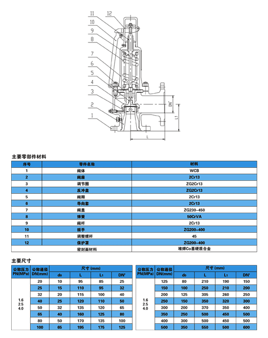 A42Y-16C~40型彈簧全啟封閉式安全閥適用于工作溫度≤300℃的氣體、液體等類介質的設備或管路上;A42Y-16P~40P型彈簧全啟封閉式安全閥適用于工作溫度≤200℃的有腐蝕性介質的設備和管路上。作為超壓保護裝置,當設備或管道內壓力超過允許值時,閥門自動開啟,繼而全量排放,當壓力降至規定值時,閥門自動關閉,保證設備和管道的安全運行。